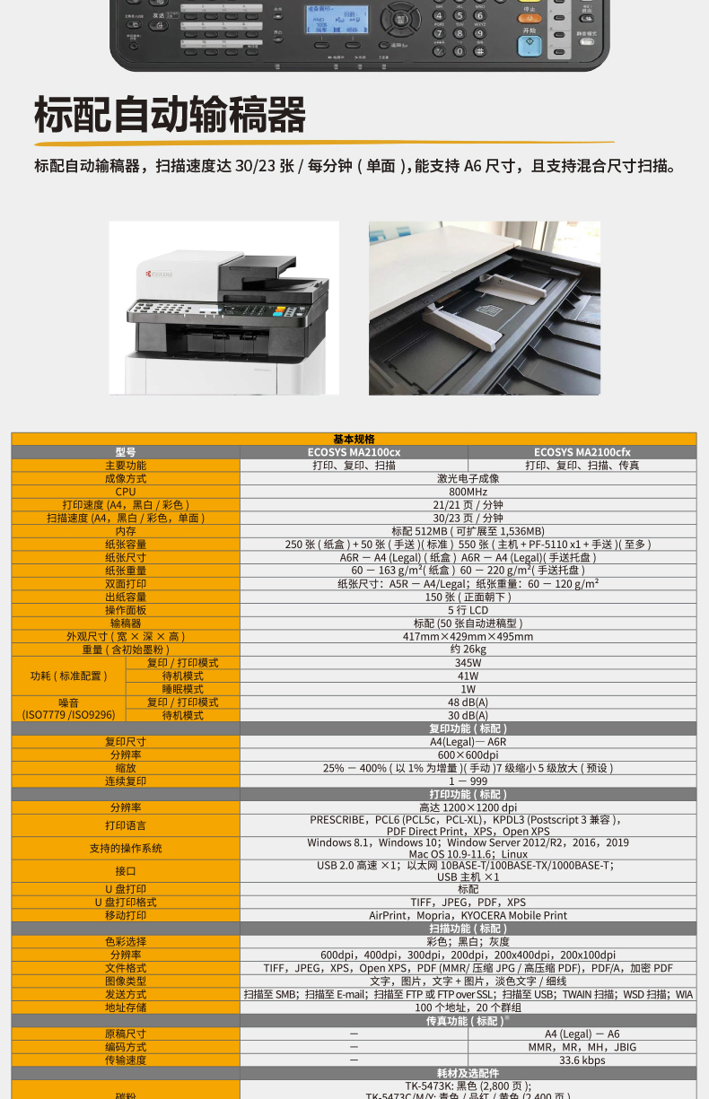 • 產(chǎn)品品牌:京瓷(KYOCERA)ECOSYS MA2100cx A4幅面彩色激光一體機(打印/復印/掃描)